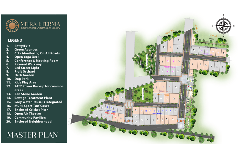 Mitra Eternia is a premium villa plotted development located on Kanakapura Road, Talaghattapura, Bangalore, spread over approximately 7.2 acres. The project offers meticulously designed plots ranging from 1,200 sq.ft. to 4,770 sq.ft., presenting an ideal blend of contemporary architecture and lush landscapes to provide a luxurious and eco-conscious lifestyle.