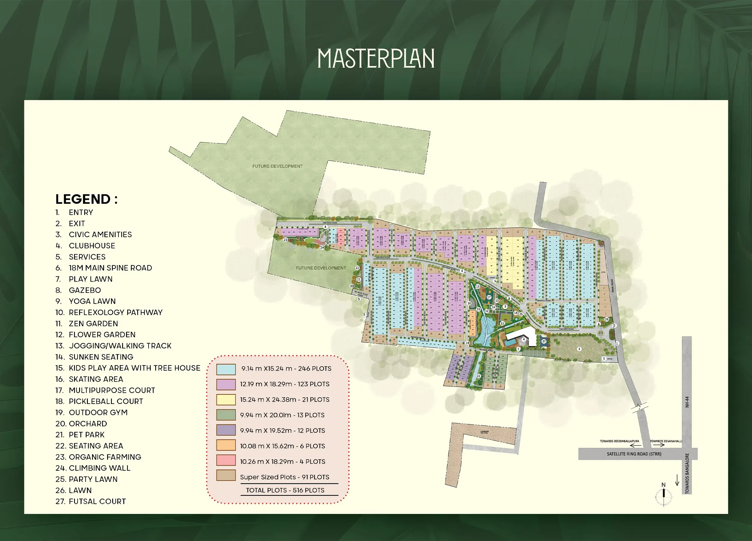 The development is enriched with over 35–60 world-class amenities, including a gated entrance with 24/7 security, landscaped parks, jogging and cycling tracks, wide internal roads, a clubhouse with gym and indoor games, children’s play zones, rainwater harvesting, underground utilities and more, delivering a harmonious blend of green living, wellness, and lifestyle.